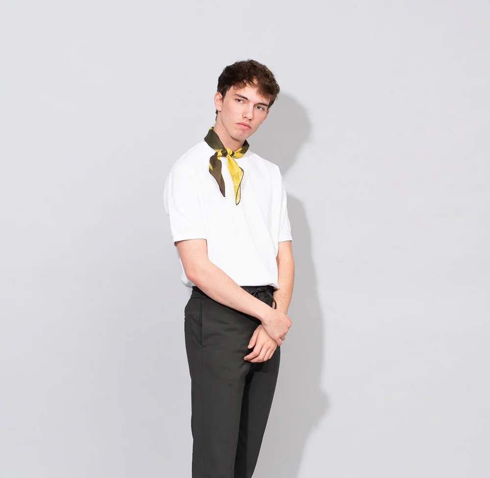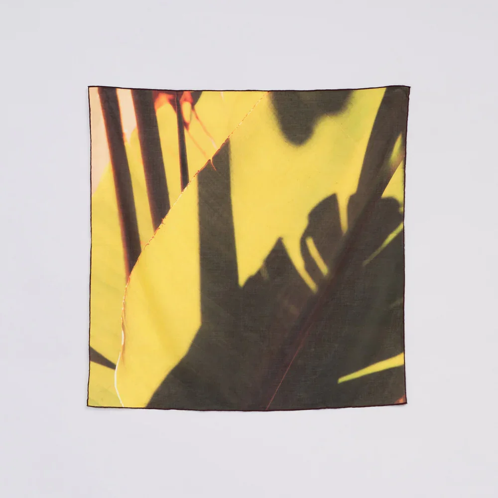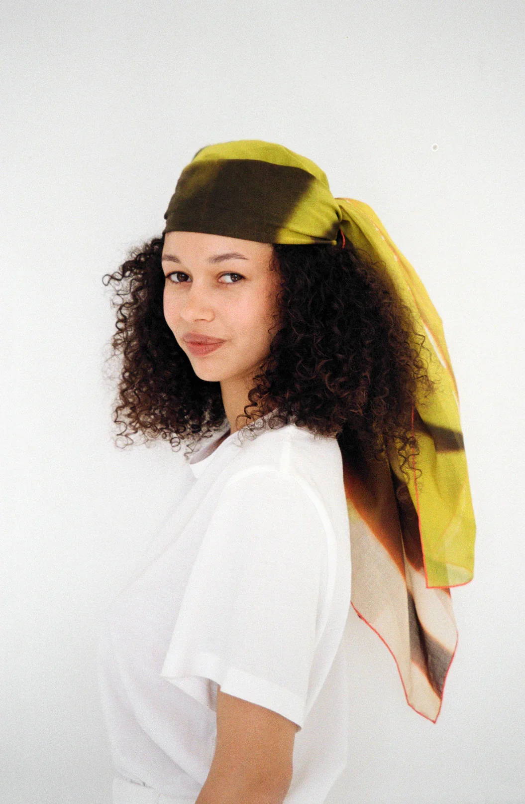 Das Design fängt das Wechselspiel von Licht und Schatten auf der Oberfläche eines Bananenblatts ein. In kraftvollen Gelbnuancen und tiefen Schattierungen entfaltet sich ein grafisches Motiv, das Wärme und Energie ausstrahlt und dem Foulard Dynamik und Tiefe verleiht, während feine Übergänge zwischen Licht und Dunkelheit eine natürliche Spannung erzeugen. Je nach Faltung entstehen immer neue Farbflächen und Kontraste – wie Sonnenlicht, das durch tropisches Blattwerk fällt.